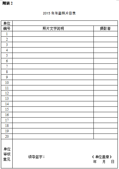 二、关于“2015年年鉴照片目录”(附表2)的填写。